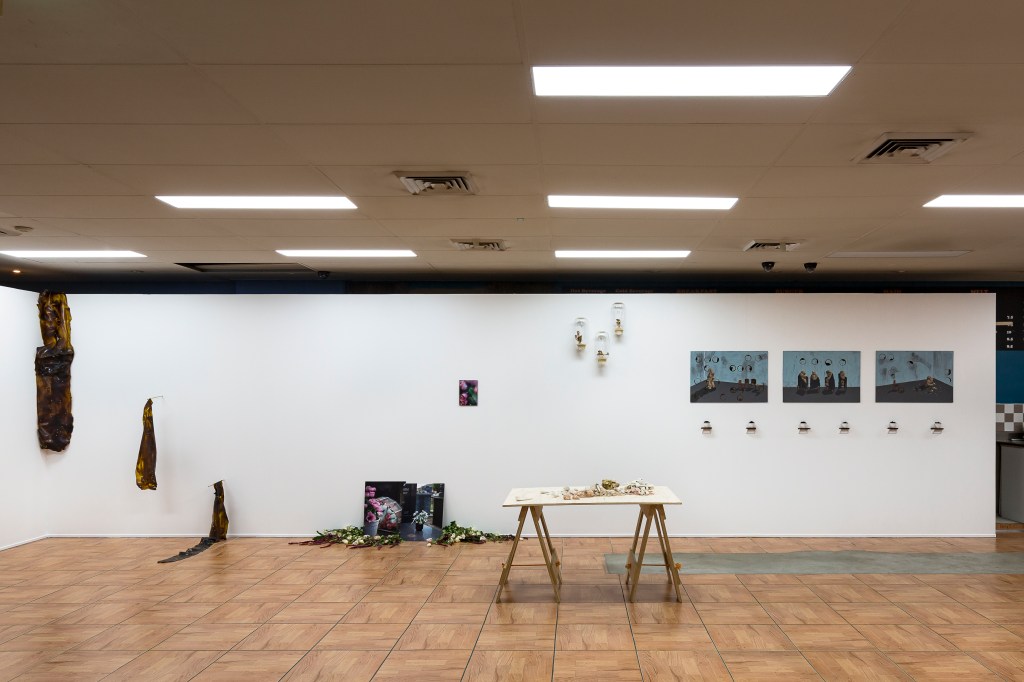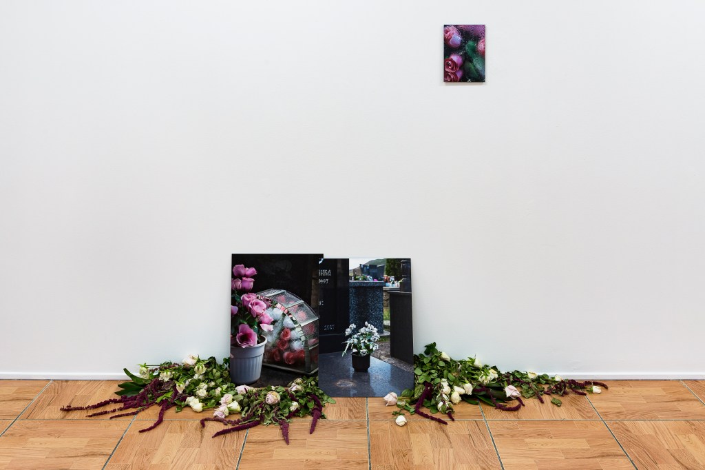 Loved ones don’t die while those who love them live, 2020, Archival cotton rag prints on Alupanel, various sizes, and decomposing organic matter. Installation documentation of group show Companions, 2020, alongside Kath Fries, Audrey Newton, Paris Norton, Chevron Hassett and Di Turner, Pari Ari, Parramatta
